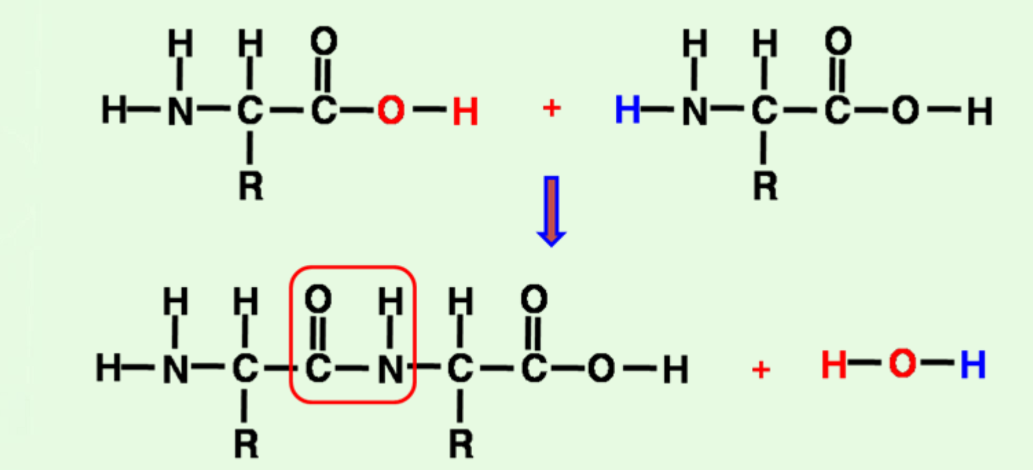 - 아미노산이 펩타이드 결합(peptide bond)으로 연결된