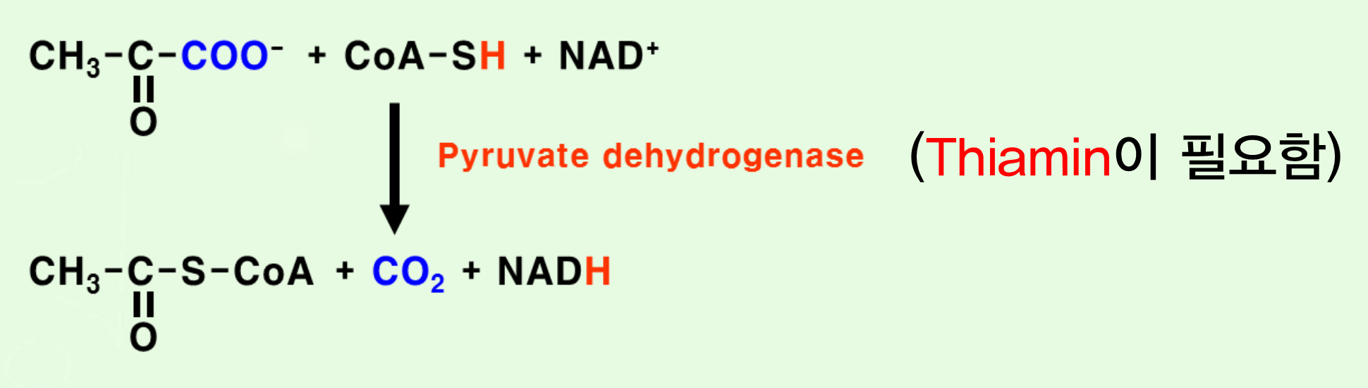 해설 : 티아민은 pyruvate가 acetyl CoA로 전환되는 과정에 조효소의 기능을 수행