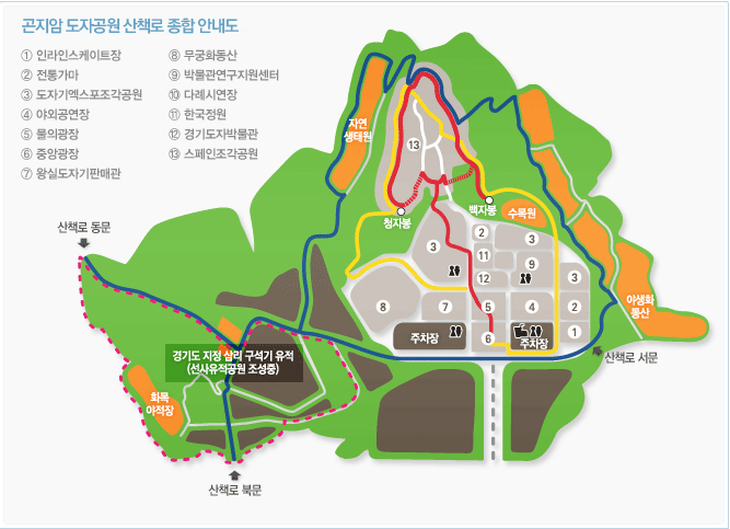 - 3코스 (3.4km) : 산책로 동문(쌍용아파트방면)/산책로 북문(곤지암방면) → 자연생태원 → 스페인조각공원 후문 → 우측등산로 → 야생화등산(버섯연구소) → 산책로 서문 → 인라인스케이트장 → 박물관창고(반환교차점)