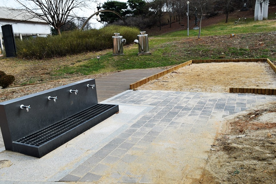 그리고 이야기 마당에는 아이들이 놀 수 있는 모래 놀이터가 있고 발을 씻을 수 있는 수도도 마련되어 있는데요.