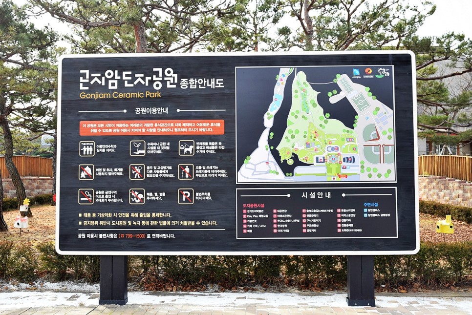 곤지암도자공원 입구의 종합안내도도 새 옷을 입고 깔끔해졌는데요. (공원을 크게 한 바퀴 도는 동안 곳곳의 안내도가 있어서 좋았스니다.) 곤지암도자공원은 박물관을 제외하고는 입장료가 없습니다. 하지만 모든 시민이 이용하는 귀중한 휴식공간인 만큼 쾌적하고 여유로운 휴식을 취할 수 있도록 이용 시 지켜야 할 사항들은 꼼꼼히 보고 공원을 이용해야겠습니다.