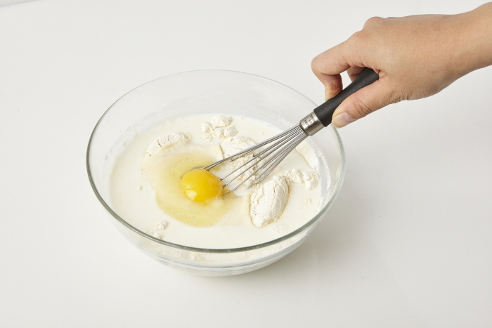 2. 우유와 달걀을 넣어 가루가 보이지 않게 섞는다.