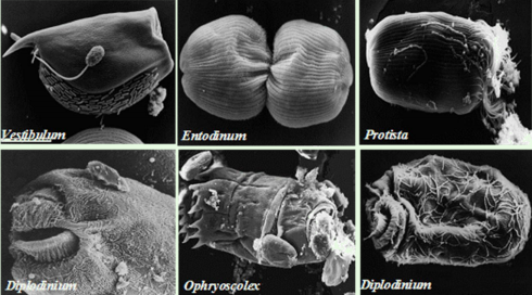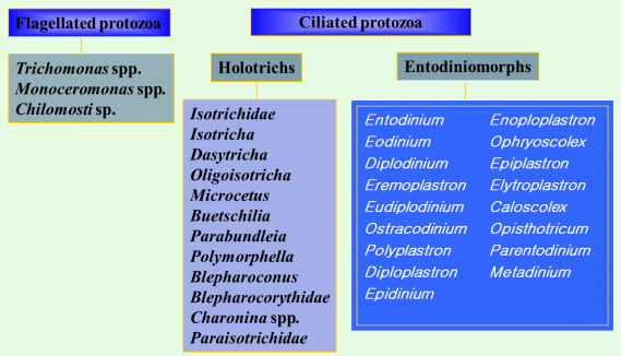 ▪ 원생동물인 protozoa는 Trichomonas, Momocermonas, Chilomosti 등의 편모충류와 Holotrichs와 Entodiniomorphs와 같은 섬모충류로 구분할 수 있다.