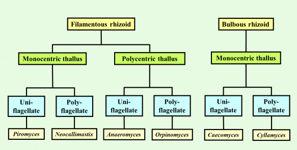 기질까지 이동할 수 있는 유주자(포자, zoospore)로 구성되어 있으며, 이러한 형태적 특징에 의해 혐기곰팡이를 분류하고 있다. 혐기성곰팡이는 섬유가근형 (filamentous rhizoid)과 구가근형(bulous rhizoid)로 구분되며, 이들은 다시 가근에 존재하는 포자낭의 개수에 따라 단일포자낭형(monocentric thallus)과 다포자낭형(polycentric thallus)로 구분한다. 이들은 다시 유주자에 존재하는 편모의 개수에 따라 단일편모형(uniflagellate)과 다편모형(polyflagellate)로 분류된다.