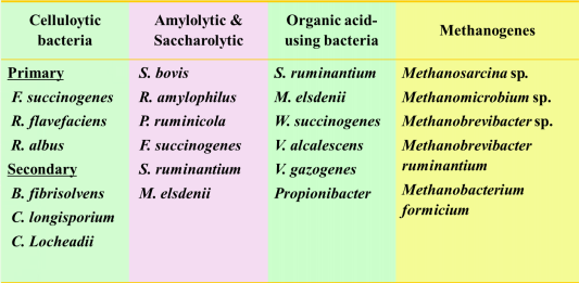 ▪ 세균은 반추위 단위중량(g) 당 1010 – 1012 개체가 존재하며, 크기는 0.3 – 50 μm 로 현재까지 17문(phylum), 6214종의 유전자가 보고되었다. 박테리아를 이용하는 기질과 대사산물의 특징에 따라 섬유소분해균, 전분분해균, 유기산이용균, 메탄생성균, 단배질분해균, 지방분해균 등이 존재하며, 이 외에도 그 기능이 정확히 밝혀지지 않은 많은 세균이 반추위에 존재하는 것으로 알려져 있다.