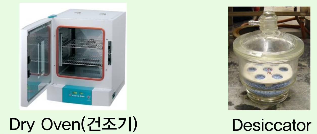 - 방법: 시료의 무게를 측정한 후 건조기에서 일정시간 건조시키고, 데시케이터(Desiccator)에서 방냉시킨 후