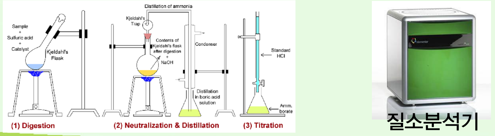 - 방법: Kjelhahl(켈달) 장치에서 황산으로 가수분해 시킨 후 질소의 붕산으로 함량을 적정(titration)하거나,