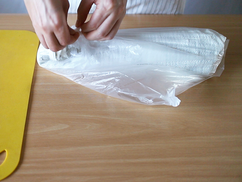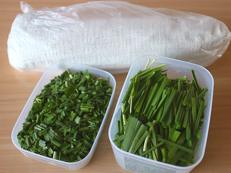 먼저 부추의 반은 바로 먹을 수 있게 냉장실에 보관합니다. 부추는 물에 닿으면 금방 물러지니 씻지 않은 부추를 이용합니다. 심하게 시든 부분이나 무른 부분을 골라내고, 마른행주에 부추를 올려 고루 펴준 후 돌돌 말아주세요.
