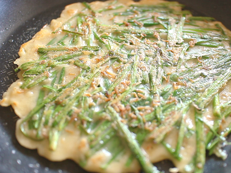 냉동실에 보관해두었던 부추를 넣어 바로 만든 부추 부침개, 작은 밥 새우를 넣어 부치면 고소하니 맛있습니다.