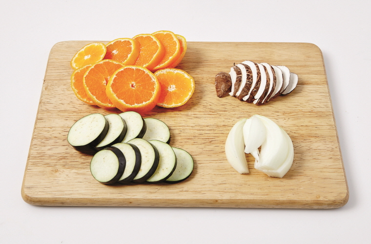 1. 귤은 베이킹소다로 껍질을 깨끗이 닦아 납작하게 썰고, 표고버섯, 가지, 양파도 납작 썬다.