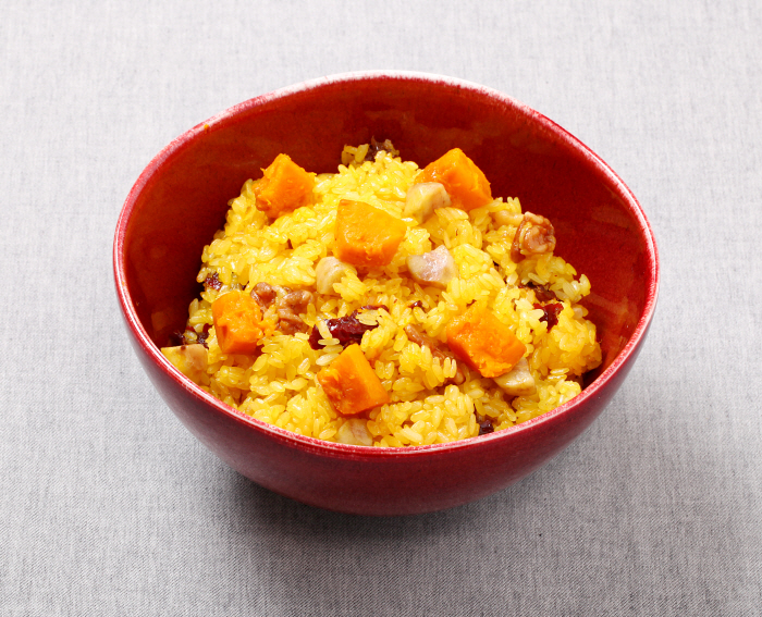 ▶ 부재료: 단호박 150g, 단호박가루 12g, 대추 5개, 호두 7개, 밤 5개, 잣 15g, 설탕 50g, 소금 10g, 참기름 30g, 치자 1개