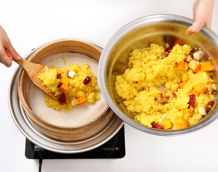 4. 1차로 찐 찰밥에 분량의 설탕을 넣어 찰밥이 알알이 떨어지도록 흩어 준 다음 분량의 단호박, 대추, 호두, 밤, 잣, 단호박가루, 소금을 넣어 밤 이 익을 때까지 2차 찌기를 한다.