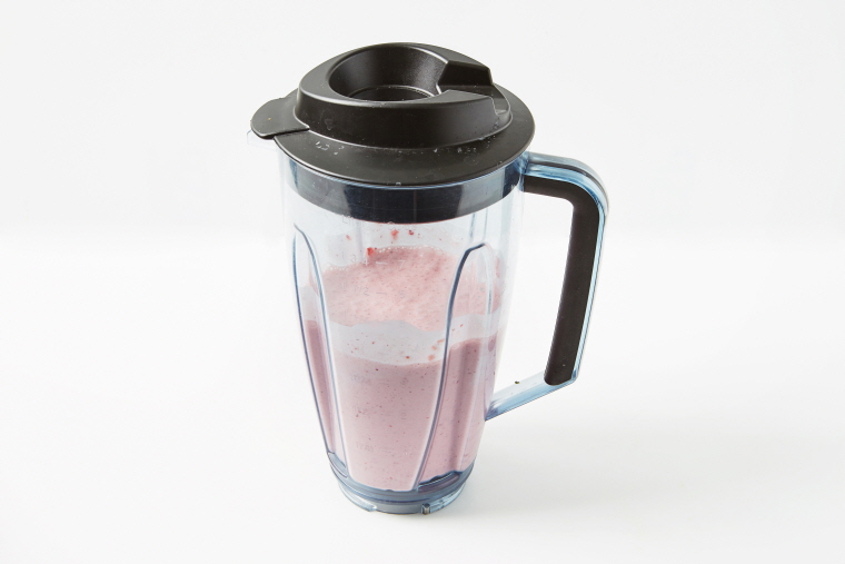 3. 믹서에 얼린 딸기, 꿀, 플레인요거트, 우유를 넣어 곱게 간다.