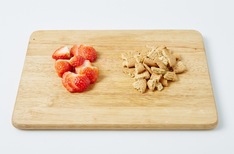 2. 생딸기(4개)는 납작하게 썰고, 통밀쿠키는 굵게 부순다.