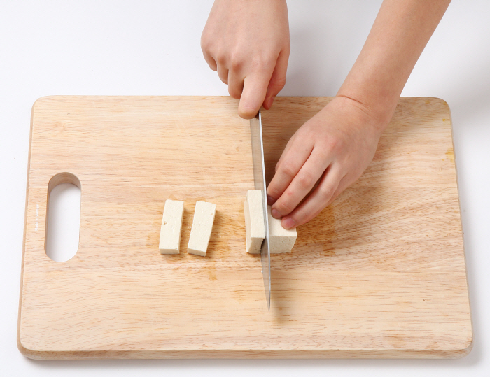 3. 두부는 물기를 제거한 뒤 2×1×4cm 길이로 썰어준다.