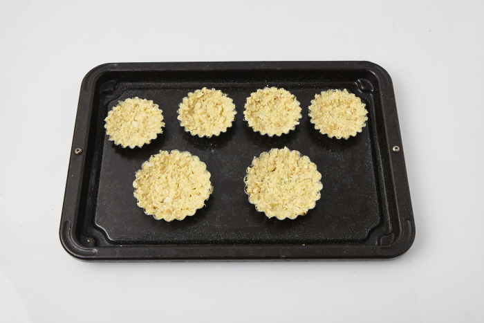 4. 조금씩 떼어낸 뒤 타르트 틀에 모양을 잡아 180℃로 예열된 오븐에 15분 간 구워 꺼낸다.