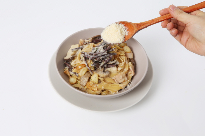 6. 간장과 소금(1작은술), 파르메산치즈(2큰술)를 넣고 섞은 뒤 맛을 보고 부 족한 간을 소금, 후춧가루로 맞춘 뒤 그릇에 담고 튀긴 마늘과 파르메산치즈 가루(1큰술)을 뿌려 마무리.