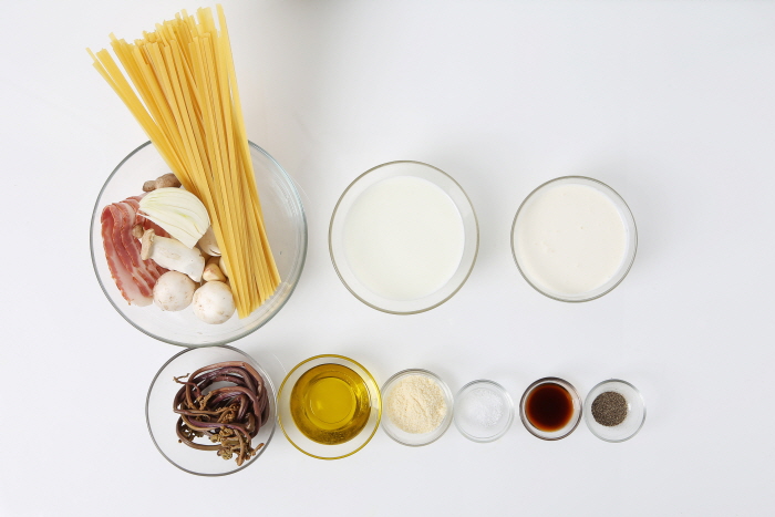 ▶주재료 : 삶은 고사리(100g), 마늘(10쪽), 양파(1/3개), 미니 새송이버섯(6 개), 양송이버섯(2개), 베이컨(4줄), 생크림(1컵=200ml), 우유(1 1/2컵 =300ml), 페투치네(200g)