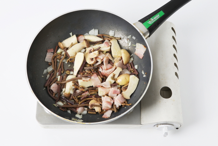 4. 같은 팬을 중약 불로 올리고 양파 - 베이컨 – 고사리 – 버섯 순으로 넣어 가며 소금(약간)을 뿌려 볶는다.