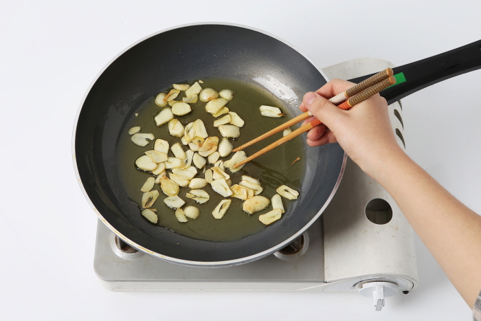 3. 올리브유(4큰술)을 두르고 달군 뒤 마늘을 넣고 노릇하게 튀겨 건진다.