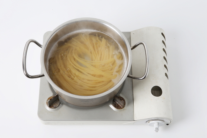2. 끓는 소금물(물 1L +소금 1작은술)에 파스타를 넣고 5분간 삶아 건진다.