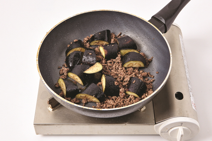 2. 중간 불로 달군 팬에 식용유(1T)를 둘러 다진 쇠고기를 볶는다.