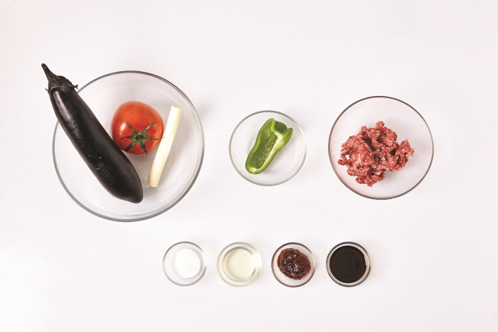 ▶ 주재료 : 가지(1개), 토마토(1개), 대파(1대), 피망(1/4개), 다진 쇠고기(120g)