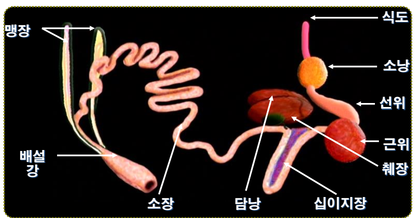 대장소화를 거치게 되며, 소화에는 펩신・아밀라아제・리파아제 등 각종 효소가