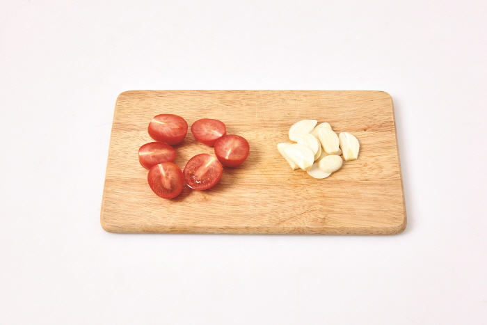 2. 방울토마토는 2등분하고, 마늘은 꼭지를 제거해 납작 썬다.