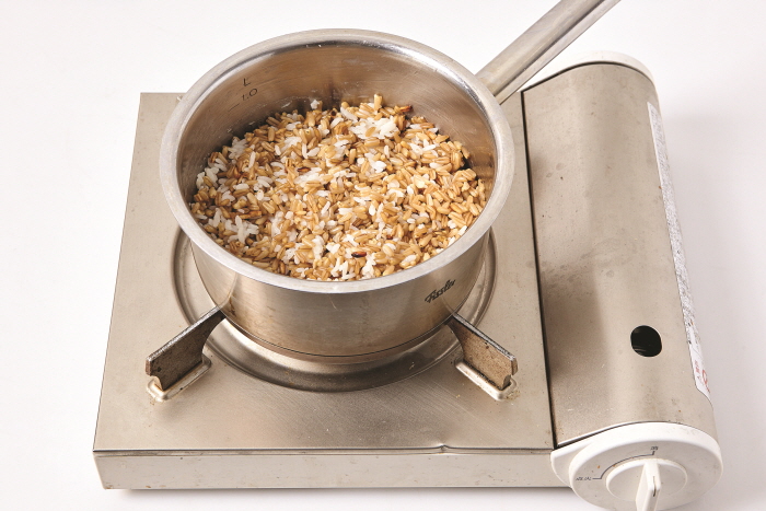 5. 센 불에서 끓어오르면 뚜껑을 덮어 중간 불로 줄여 15분, 불을 끄고 5분간 뜸을 들여 밥을 짓는다.