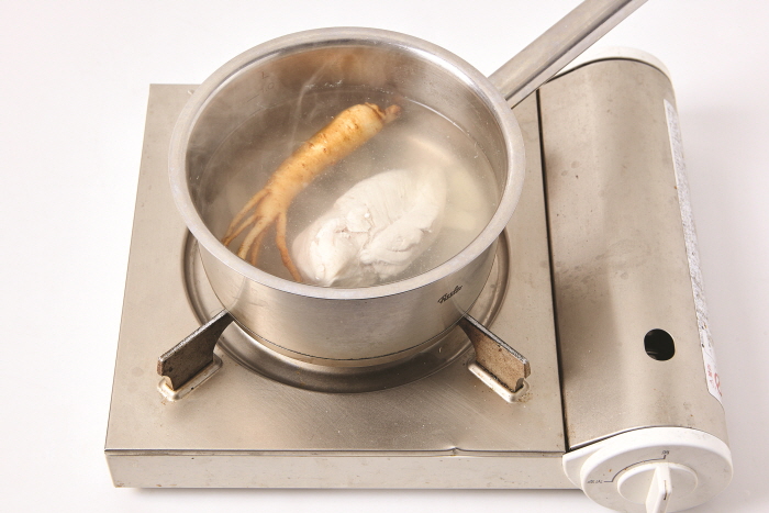 3. 냄비에 닭가슴살, 마늘, 수삼을 담고 물(3컵)을 부어 중간 불로 익힌 뒤 육수를 체에 거른다.