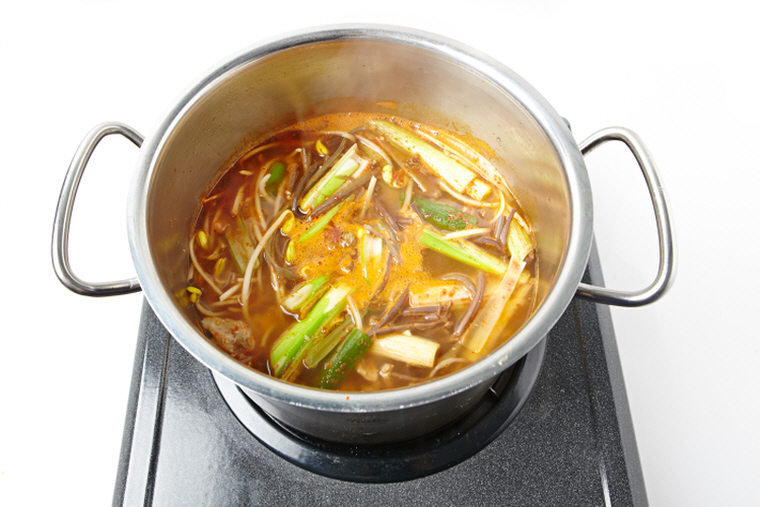 7. 육수가 끓어오르면 손질한 재료와 양념장을 넣어 푹 끓인다.