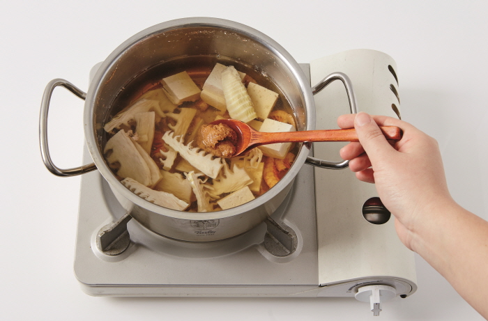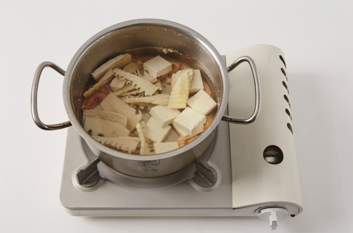 3. 육수(3 1/2컵)에 죽순과 두부를 넣어 중간 불로 5분간 끓인다.