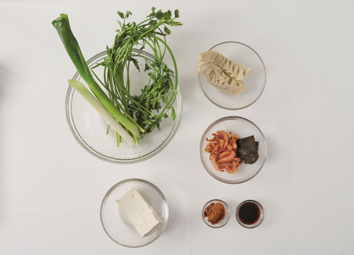 ▶주재료 : 다시마(1장=10x10cm), 건새우(½컵), 죽순(100g), 미나리(1/2줌), 두부(1/3모=100g), 대파(1대)