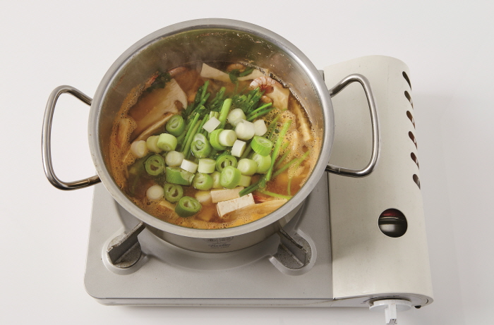 5. 미나리를 넣고 한소끔 끓인 뒤 대파를 넣고 불을 꺼 마무리한다.