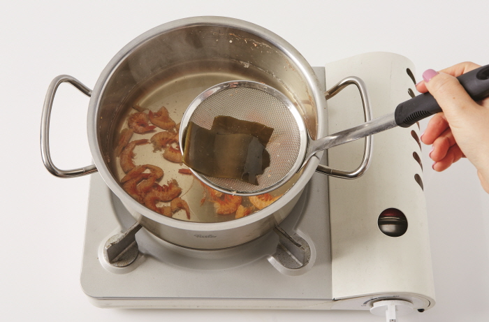 1. 냄비에 물(5컵)과 다시마, 건새우를 넣어 끓어오르면 다시마는 건져내고 10분간 더 끓여 육수를 만든다.