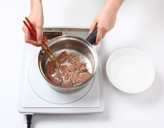 5. 쇠고기100g을 나박나박 썰어서 다진마늘, 다진파, 참기름, 후추로 양념해두 었다가, 불에 달군 냄비에 넣어 볶은 뒤 물 1L를 넣고 육수를 낸다.