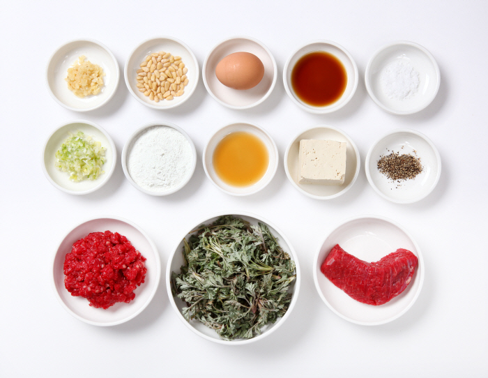 3. 볼에 다진쇠고기, 두부, 쑥을 넣은 뒤 마늘 8g, 파 16g, 소금, 참기름 7g, 후 추 등의 양념을 넣고 찰기가 지도록 반죽한다.
