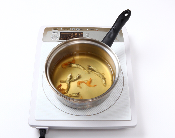 ▶ 육수재료: 국물용 멸치 6마리, 다시마 4조각, 무 50g, 건새우 6마리, 물 6컵