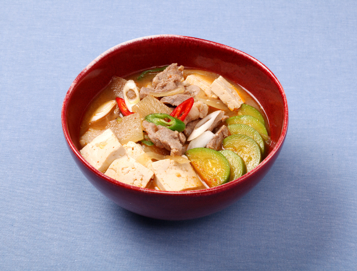 ▶ 부재료: 양파 1/2개, 무 50g, 애호박 1/3개, 두부 1/2모, 청양고추 1개, 홍고 추 1개, 대파 1/2대, 된장 3큰술, 고춧가루 1/2큰술, 다진마늘 1큰술