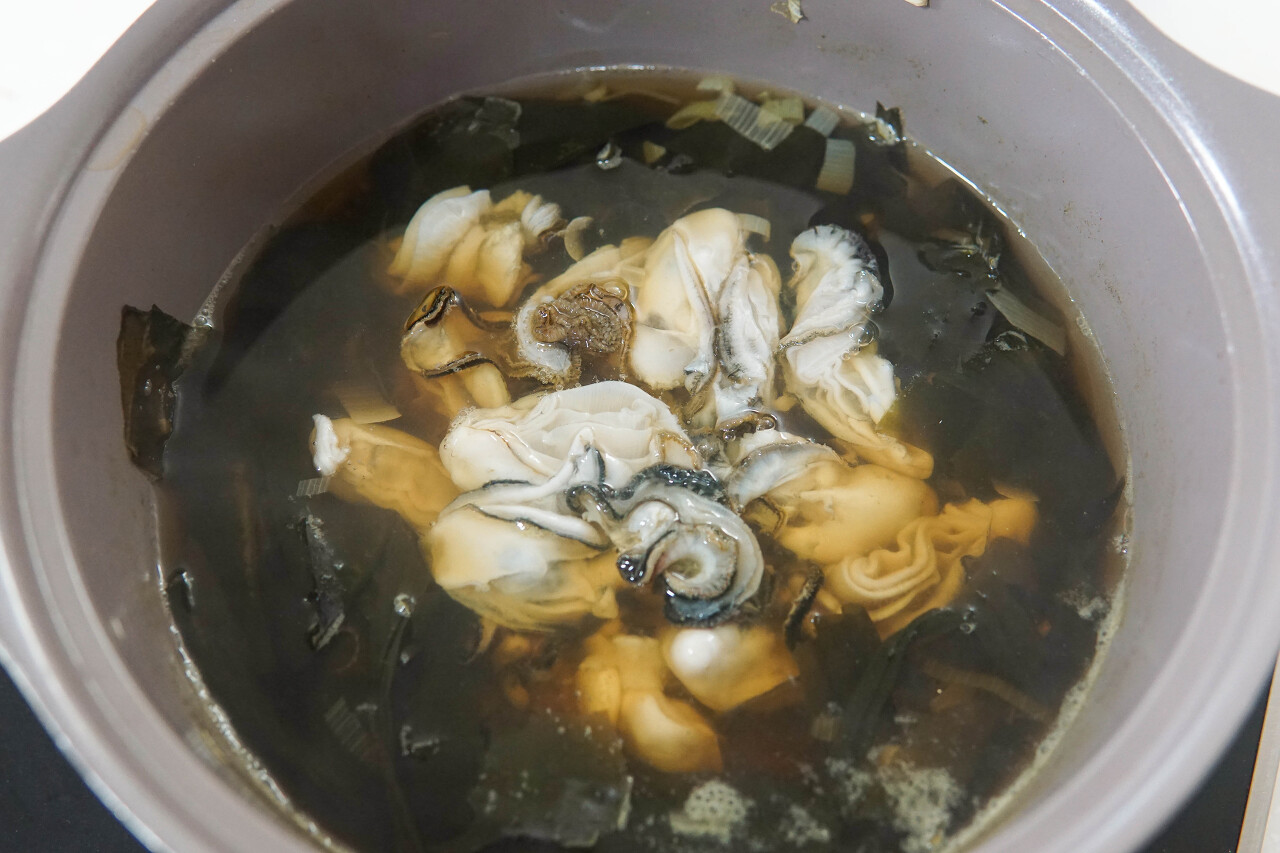 3. 미역이 흐물흐물하게 익으면 손질한 굴을 넣고 끓인다.