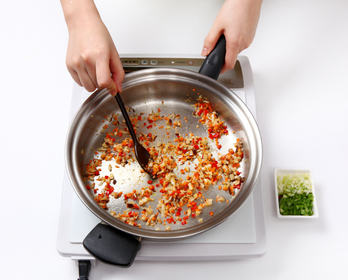4. 야채는 굵게 다져 썰고, 양파, 생강부터 볶은 다음 당근, 표고, 홍고추를 넣 어 볶는다.