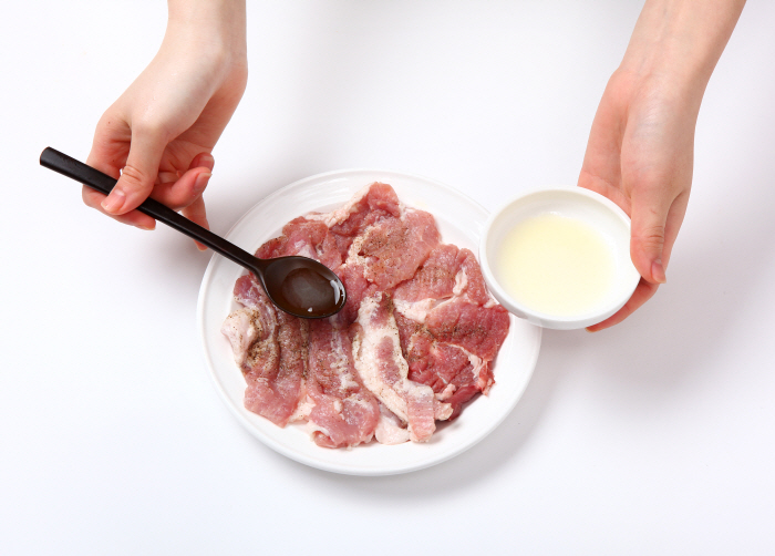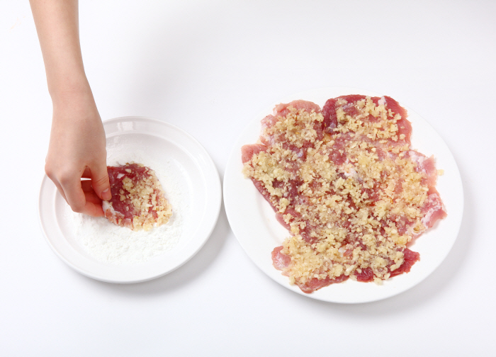 2. 돼지고기는 넓적하게 잘라서 자근자근 두드려 펴주고 소금, 후추, 청주, 생 강즙을 뿌려 재워둔다.