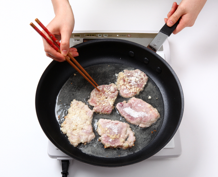 3. 준비한 돼지고기에 마늘을 올리고 녹말가루를 무쳐준 후 잘 달구어진 팬에 식용유를 넉넉히 두르고 노릇노릇 지진다.