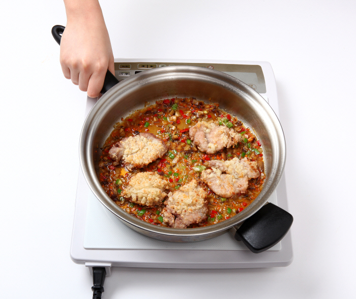 5. 달궈진 팬에서 조림장 재료를 섞어 볶아놓은 야채가 뜨거울 때 넣고, 한 번 끓어오르면 ③의 고기를 넣어 졸인다.