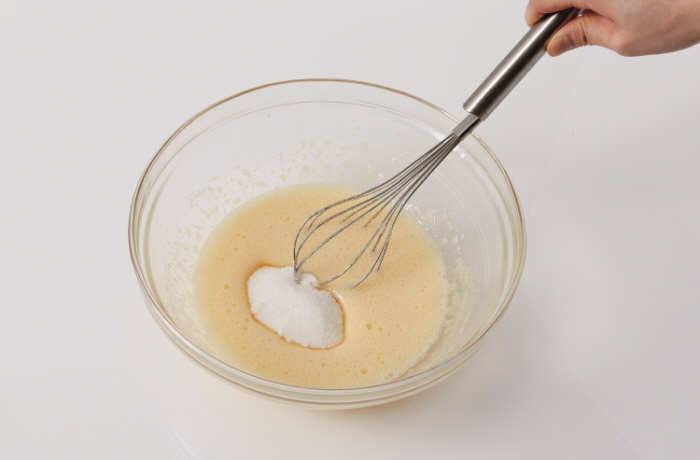 4. 볼에 달걀을 넣어 거품기로 충분히 거품을 낸 뒤 설탕을 2~3번에 나눠 섞는다.