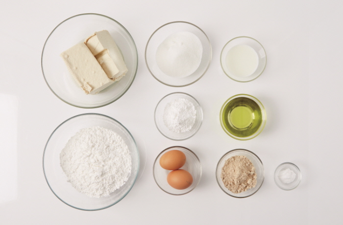 ▶주재료 : 두부(2/3모=200g), 달걀(2개), 설탕(150g), 포도씨유(100g), 미숫가루(30g), 박력 쌀가루(220g), 베이킹파우더(½t), 우유(⅓컵)