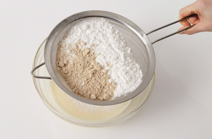 5. 설탕이 녹으면 포도씨유와 우유를 섞은 뒤 미숫가루(30g), 박력분(220g), 베이킹파우더(1t)를 체에 걸러 넣는다.