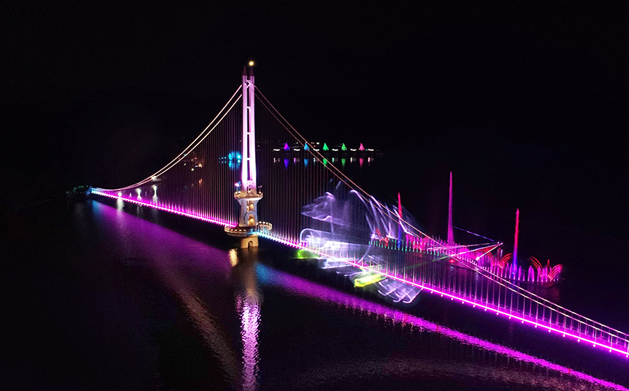 출렁다리는 야간에도 형형색색 조명으로 찬란하게 빛난다. 그라데이션 기법으로 시시각각 변하는 무지개 빛깔 LED조명은 몽환적인 분위기를 자아냅니다.