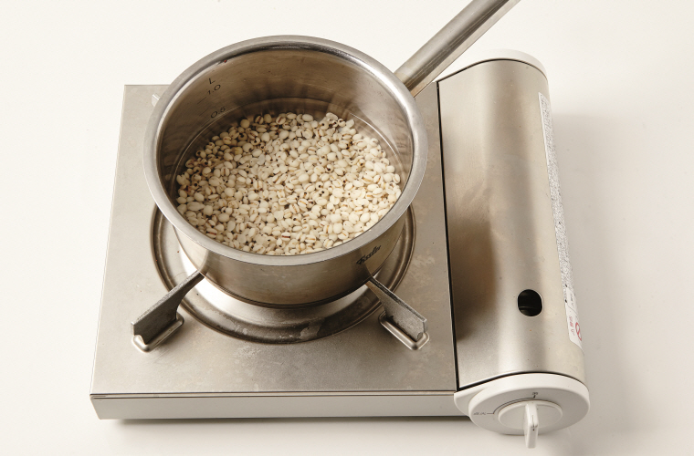 1. 율무는 흐르는 물에 2~3번 헹군 뒤 냄비에 넣고 넉넉하게 물을 부어 삶는다.